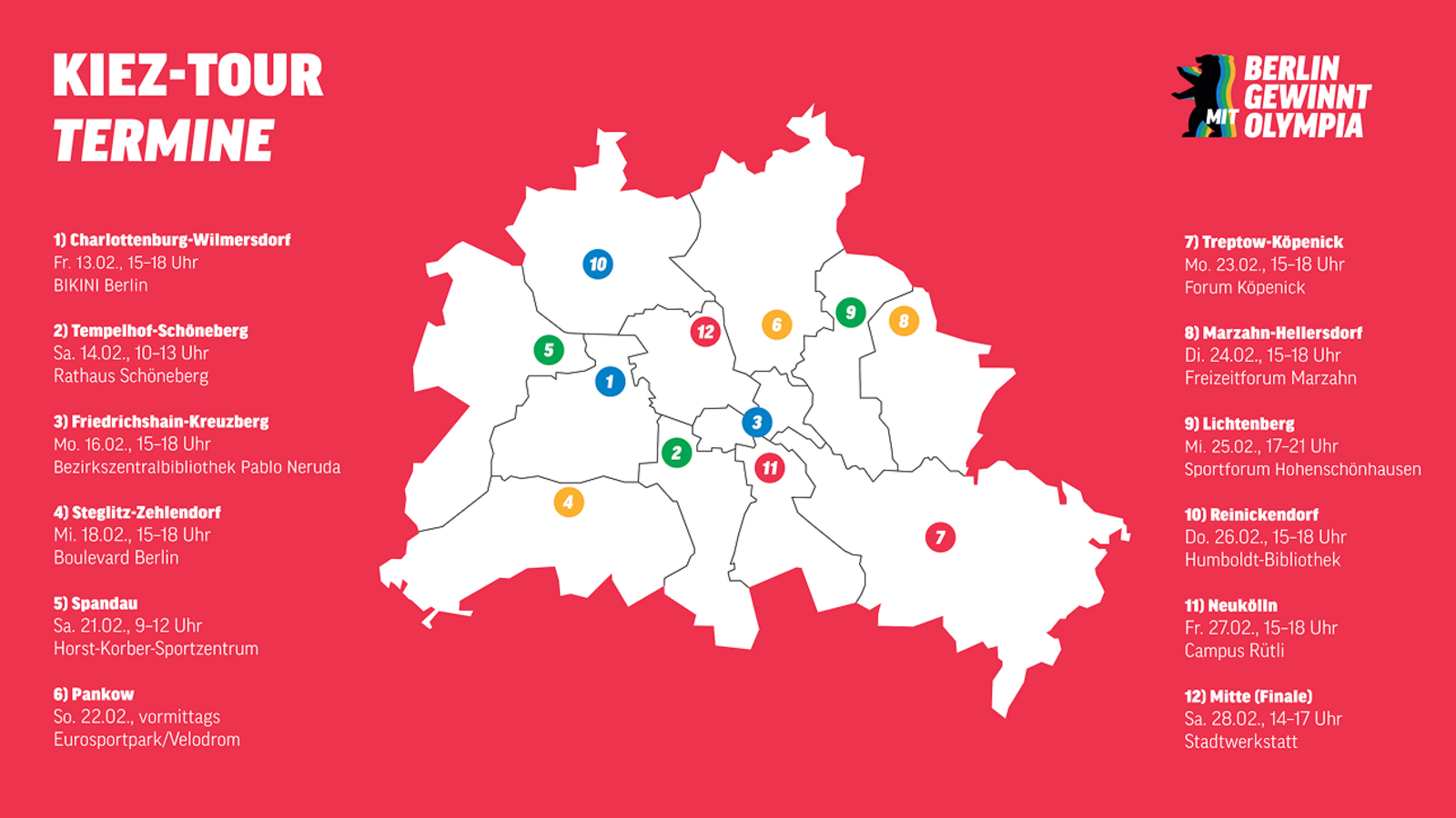 Wir kommen in die Bezirke und gehen mit den Menschen vor Ort ins Gespräch. An zwölf Stationen im Februar sammeln wir Feedback, Meinungen und Prioritäten zu den zentralen Themen der Bewerbung.